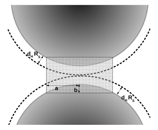 The volume is assumed to be formed within a narrow gap between the spherical caps of the horizons of the components of the BBH just before their mutual touching as shown in Figure 1. The thickness of the UVS can be taken as , provided that the power in (2) is not very high so that the transition rate does not change dramatically across the UVS. Thus, one can represent as a body bounded between the convex surfaces of two spherical caps separated at their closest points by distance as shown in Figure 1. The volume can be calculated as