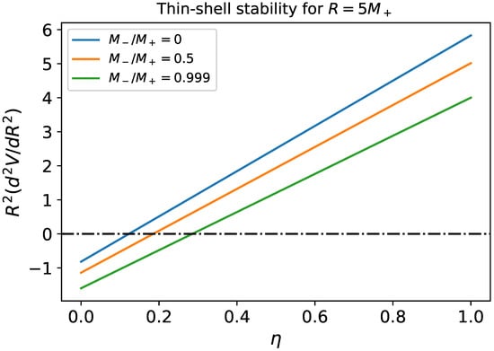 Figure 1 shows the stability condition () for several matches of Schwarzschild spacetimes with masses leading to at . One sees from the aforementioned plot that thin shells are stable for most and internal-to-external mass ratios. This suggests that is a feasible choice for the equilibrium radius of a thin shell with nontrivial surface degrees of freedom.