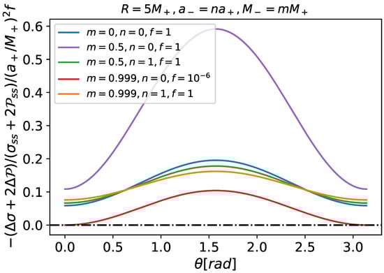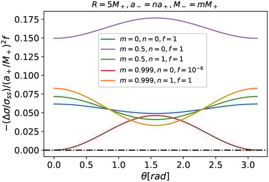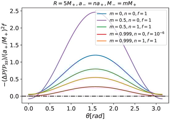 Relative surface energy density corrections due to rotation () for some parameters of the glued spacetimes. Internal and external mass ratios were chosen to coincide with those of Figure 2. To be more general, we did not specify the particular rotational parameter ; we just assumed it was small. The factor “f” is only for convenience (plotting all the cases in a similar scale). Negative n’s lead to the same results as their positive counterparts. Note that, for all the cases and polar angles, , meaning that rotation decreases the local surface energy density on the thin shell.