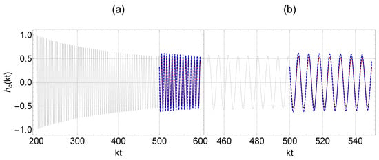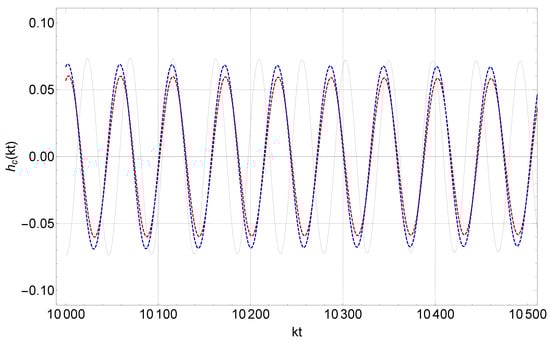 In the context of modified gravity, which involves modifying the propagation of gravitational waves by introducing an additional term [,] (illustrated in Figure 1 and Figure 2), the amplitude of the gravitational waves (blue waveforms) after the gravitational transition through the scalar–tensor theory of gravity is altered compared to the red waveforms, corresponding to transitions in the context of general relativity. This amplitude may increase or decrease depending on the phase of the gravitational wave at the time of the transition and also on the sign of the -function impulse determined by the transition amplitude .