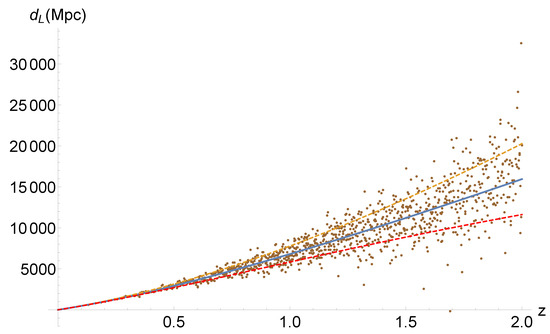 By comparing the luminosity distance measurements obtained from gravitational waves with those obtained from electromagnetic observations, such as type Ia supernovae or galaxy surveys, it is possible to test and constrain modified gravity theories [,]. Any significant discrepancy between the two sets of measurements could provide evidence for deviations from general relativity and help identify the correct gravitational theory.