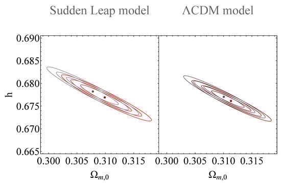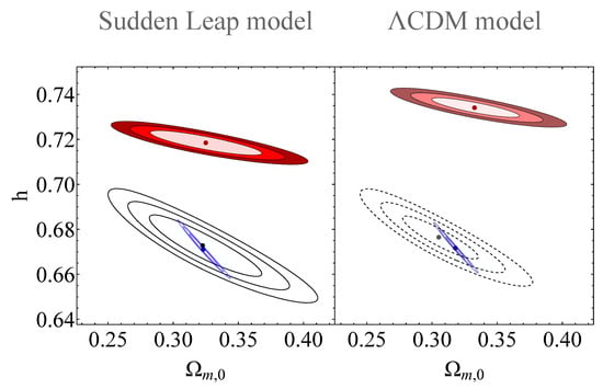 We thus impose constraints on a transition in the value of the effective gravitational constant , which would induce a sudden change in the Hubble flow rate. If such a change is advocated through a phenomenological parametrization of the form , where is a dimensionless parameter and is the Heavyside step function, then it is deemed to exhibit the characteristics of a sudden cosmological singularity [,,,,,]. For instance, in sudden cosmological singularities or type II, at the time we have a divergence of pressure with a finite density and scale factor , while the scale factor is continuous at [,,,]. The Hubble flow is finite, or , but the its derivative diverges, or . In this case, the divergence of pressure leads to a violation of the dominant energy condition []. A geodesically complete singularity (like the sudden cosmological singularity [,,]) involves a divergence of a derivative of the scale factor while and through the moment that occurs.