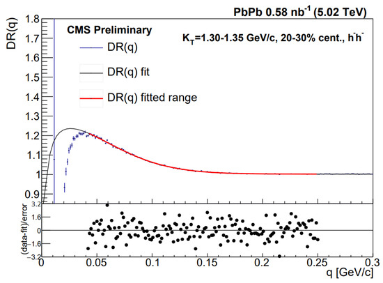 An example fit to the double-ratio correlation function of negatively charged hadrons [41]. The fitted function is shown in black, while the red overlay indicates the range used for the fit. The and centrality class is shown in the legend. The lower panel indicates the deviation of the fit from the data.
