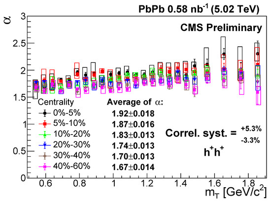 The Lévy stability index versus the transverse mass in different centrality classes for positively charged hadron pairs [41]. The error bars are the statistical uncertainties, while the boxes indicate the uncorrelated systematic uncertainties. The correlated systematic uncertainty is shown in the legend.