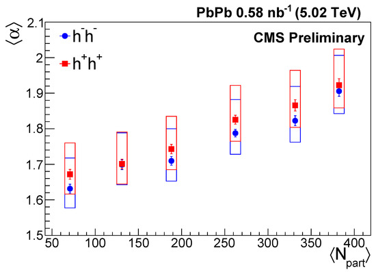 The average Lévy stability index versus in different centrality classes for positively and negatively charged hadron pairs [41]. The error bars are the statistical uncertainties, while the boxes indicate the systematic uncertainties.