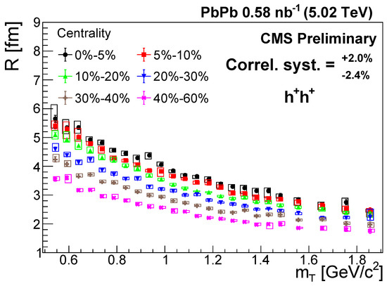 The measured R values are shown in Figure 4 as a function of for positively charged pairs. A decreasing trend with and as the collisions become more peripheral is observed, with the values ranging between 1.6 and 5.8 fm. The centrality dependence confirms the geometrical interpretation of the R parameter, because a smaller source size is expected in case of more peripheral collisions. To further investigate the dependence of R, was plotted as a function of , as shown in Figure 5. In case of a Gaussian source, hydrodynamic models [7,43] predict the linear scaling
