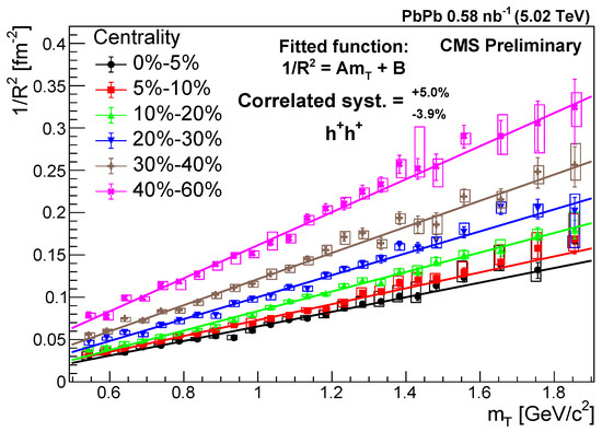 The inverse square of the Lévy scale parameter R versus in different centrality classes for positively charged hadron pairs [41]. The error bars are the statistical uncertainties, while the boxes indicate the uncorrelated systematic uncertainties. The correlated systematic uncertainty is shown in the legend. A line is fitted to the data for each centrality.