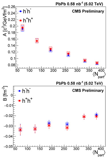 In order to verify whether the linear scaling also holds in the Lévy case, a linear fit was performed for each centrality class using Equation (13). The statistical uncertainty and the uncorrelated systematic uncertainty of was added in quadrature and used for determining the of the fits. In this way, the confidence levels were statistically acceptable for each centrality class, showing that a hydrodynamic-like scaling holds for a Lévy source as well. The fitted lines are shown in Figure 5, and the fit parameters (A and B) are shown in Figure 6 as functions of , for both positively and negatively charged pairs. By assuming a constant freeze-out temperature of MeV [45], the Hubble constant falls between 0.12 c/fm and 0.18 c/fm. Due to the fact that the A parameter decreases toward more central collisions (larger ), the Hubble constant also decreases, making the speed of the expansion lower in central collisions. The B parameter has a negative value in each case, which makes it impossible to calculate a freeze-out size using Equation (15). The reasons behind a negative intercept and the interpretation of this result are currently unknown. This may be connected to fluctuations in the initial state [46] which were not taken into account in the hydrodynamic models.