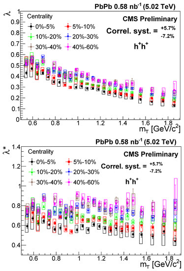 Equation (1) implies that . In previous measurements, it was found, however, that . This result can be understood via the core–halo model [25,26], wherein the source is divided into two parts, a core of primordial hadrons and a halo of long-lived resonances. The halo is experimentally unresolvable due to its large size, which leads to small momentum in Fourier space. If S represents only the core part of the source, its connection to the correlation function becomes