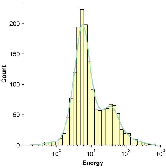 Energy distribution of bursts from FRB 20121102 since MJD = 58,724. The green line denotes the kernel density estimate (KDE) of the energies.