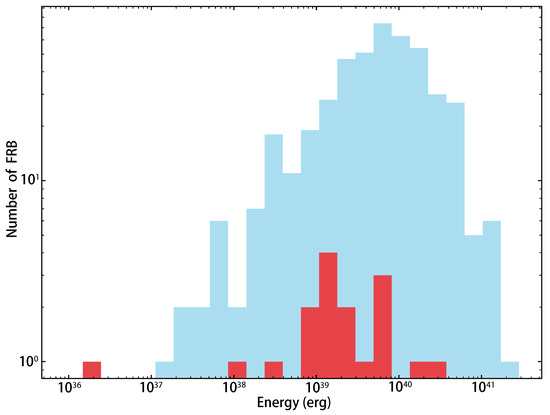 Energy distribution of repeaters in red bars and non-repeaters in blue bars.
