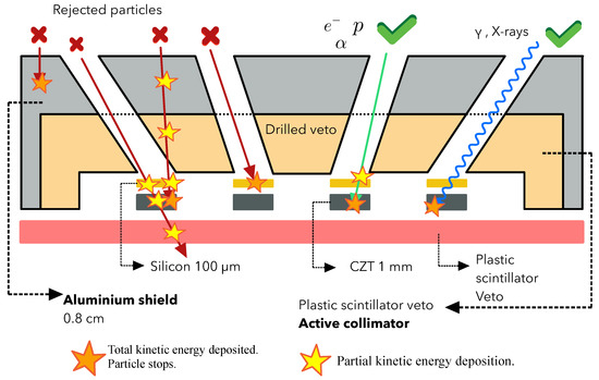 In Figure 1, the detection concept and a schematised cross-section of the instrument are shown. In Figure 2, the LEM geometry is displayed within the developed GEANT4 simulation. From the top, we can see the drilled aluminium mask, in transparent grey, suppressing the flux of very low energetic particles. Below the aluminium shield, the active anti-coincidence is obtained by using a drilled plastic scintillator, displayed in transparent blue, (polyvinyl toluene). The aluminium drilled mask and the drilled anti-coincidence detector (ACD) define the so-called active collimator. For an LEM operating in low Earth orbit (LEO), an aluminium thickness larger than is necessary to reduce the veto rate from several MHz to the affordable rate of ∼kHz. Below the active collimation system, we place the 16 independent modules. These modules will measure the angular flux of particles crossing the veto channels ( cm × 1.3 cm), determining one specific solid angle in the sky with a resolution of about 7. The sizes of the commercially available PIPS detectors (50 mm–⊘8 mm each) have been considered to define a realistic geometry in the detector simulation. The detector consists of a -thick PIPS detector, while the E detector is a CdZnTe (or CZT) detector with thickness. These two layers allow for good particle identification in the energy ranges of approximately 0.1–10 MeV for electrons, 3–30 MeV for protons, and 10–100 MeV for alpha particles. A bottom plastic scintillator (ACD), not shown in Figure 2, is added at the very end of the LEM to ensure that the energy release is confined within the above layers. A plastic scintillator (ACD), displayed in cyan, is inserted on all four sides to ensure lateral confinement. In particular, particle identification (PID) is not possible for the energetic particles crossing the ACD nor for slow particles stopped in the front PIPS. Events with an undefined direction are rejected thanks to a signal released in the active veto/collimator. Finally, events that are fully contained within the LEM are selected. In this very last case, the direction is well defined, and it is also possible to perform an accurate PID. Thanks to the high density and high averaged atomic number of CZT [21,22], the LEM can identify low-energy -rays converting in the CdZnTe (CZT) mini-calorimeter using all the surrounding low-Z sensors as anticoincidence. The ability to observe energetic photons will allow for the additional use of this compact particle spectrometer as a gamma-ray burst (GRB) monitor [23].