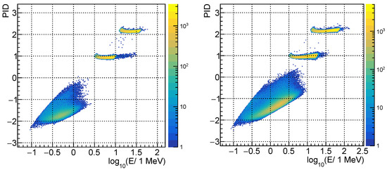 PID classifier vs. kinetic energy. (Left): 100 –500 PIPS detectors. (Right): PIPS and CZT detectors. The three different clusters in each plot represent (from the top to the bottom): alpha particles, protons, and electrons.