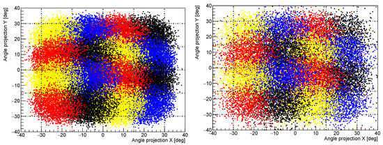 Angular projection of the projectile’s incident direction. In this graph, the plane is parallel to the detectors. The colour code identifies the silicon sensor pair that detects the particle. Left plot is relative to proton and alpha particles, whereas in the right plot electron events are shown.