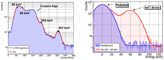 In particular, is one of the constituents of the LYSO crystal scintillator. is a naturally available (2.6%) and long-lived () isotope of lutetium. It decays to . The decay chain involves the emission of three rays with energy, respectively, , , and [39]. In addition, there is a peak at ∼ due to the emission line. The expected activity of LYSO material is ∼. A thin LYSO scintillator (8 g) was coupled to an Hamamatsu R5946 PMT in order to tag the decay with 100 ns coincidence with the silicon detector. In Figure 6 (left), it is possible to see the energy spectrum measured by the silicon detector exposed to the LYSO radioactivity. To verify the calibration curve at low energy, we used the gamma line emitted by the calibration source. Moreover, by removing the source we also measured the “pedestal”, which is the signal detected by the detector, due to the electronic noise, in the absence of energy deposition. Figure 6 (right) shows the results from the measurements with the Americium source. As it is possible to see, the pedestal measurement allows for the characterisation of the electronic noise and background in the detector.