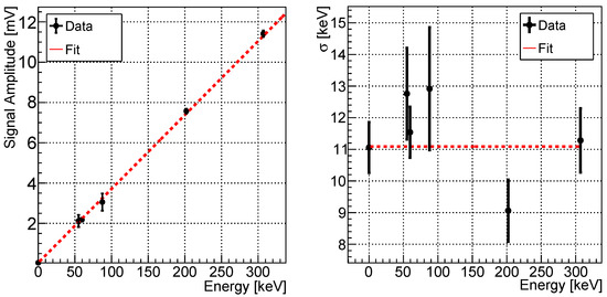 Figure 7 shows the calibration curve and the detector’s resolution estimation. On the right-hand side of the plot, the detector’s resolution estimation is reported. This calibration procedure provides a calibration constant: and an energy resolution of: .