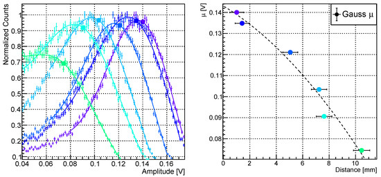 In Figure 10, it is possible to see different alpha particle amplitude spectra measured for different distances from the Am source. To minimise the alpha particle angular spread, we apply a collimator made by a tape with a small central hole in front of the source. Unfortunately, the exact thickness (a few mm) of the air gap within the source itself is not known (we did not exactly measure it to avoid damaging the thin source). Moreover, the source material composition and exact geometry of the Am isotope distribution within the source material are also unknown. This adds an unknown, positive, air-equivalent offset to our measured distance. The measured alpha particle energy distributions are not Gaussian and present long tails at low energies; this is due to different energy losses in air and source due to different inclinations and multiple scattering, but detector effects can also contribute [41]. For this reason, we fitted those spectra with a Gaussian curve modified with the addition of a linear tail function. After the fitting procedure, we provided an estimation of mean value of the Gaussian . From Figure 10, it is also possible to estimate the derivative of the signal amplitude as a function of the distance, which is a quantity proportional to the stopping power . However, the stopping power is a function of the particle’s energy. As a consequence, a quantitative calibration from Figure 10 is challenging because of the unknown air-equivalent distance offset. Thus, by measuring , we can remove the dependence on the calibration constant from voltage to energy. This quantity is still dependent on the true particle kinetic energy. Therefore, by assuming an hypothesis on the alpha particle calibration constant, it is possible to compare the measurement with the expectation from a Monte Carlo simulation of alpha particles crossing the air.