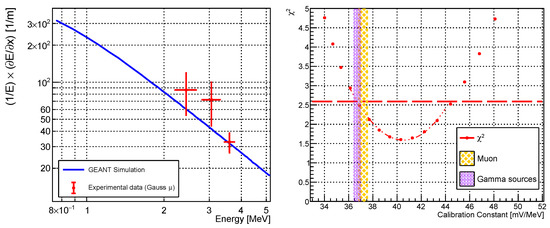 As an example, in Figure 11, the (x-axis) energy estimation adopts the calibration constant measured with gamma sources (described in Section 6.1). Finally, scanning different values for the calibration constant, we can measure this parameter for alpha particles by the computation of the for each hypothesis, as shown in the right panel of Figure 11. We obtain that is reached at . From the standard confidence interval evaluation, we deduce that the obtained result is compatible with the calibration constant obtained for gamma-ray and muons. Thus, the detector behaves as expected/desired and no evidence for a detector response depending on particle dE/dx is found. Summarising the result of this analysis, the measured calibration constant for alpha particles is .