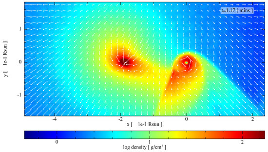 Figure 1 shows a snapshot of the mass density with the vector velocity field at the binary’s equatorial plane some minutes after the CO collapse and the expansion of the SN ejecta. The system’s evolution was simulated with an SPH code, where the NS companion and the NS are point particles that interact gravitationally with the SPH particles of the SN ejecta. For details of these numerical simulations, we refer to [23,43]. In these simulations, the influence of the star’s magnetic field has be disregarded, as the magnetic pressure remains significantly lower than the random pressure exerted on the infalling material. The simulation of Figure 1 corresponds to a CO-NS for a CO star evolved from a zero-age main-sequence (ZAMS) star of . The CO mass is about 3.06 , whose core collapse leaves a NS and ejects . The NS companion’s initial mass is 1.4 , and the initial binary period of the system is about min.