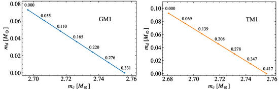 From Equations (2), (7) and (10), and the conservation Equations (1), (4) and (11), we can obtain the remnant and disk’s mass as a function of the angular momentum losses, , as well as an estimate of the energy and angular momentum released in the cataclysmic event. We use the NS structure parameters obtained for the GM1 EOS and the TM1 EOS. The total gravitational mass of the system is , so using Equation (2), we obtain the total baryonic mass of the binary, . The binary’s mass fraction is , so we assume the merger starts at the contact point. With this, the angular momentum at the merger, as given by Equation (10), for the GM1 and TM1 EOS is, respectively, and .