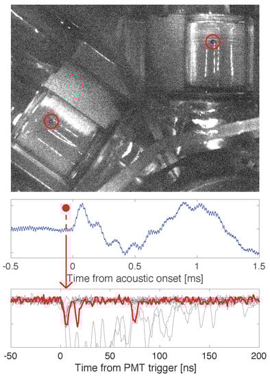 Figure 1. Sample nuclear recoil event from the prototype xenon bubble chamber [12]. (top) Stereo image of a single xenon vapor bubble (circled in red). (middle) Acoustic record of bubble formation. (bottom) PMT waveforms showing xenon scintillation. The bubble-coincident pulse is shown in red, while electron recoils in the same bubble time window generate scintillation pulses without coincident bubble nucleation (gray traces).