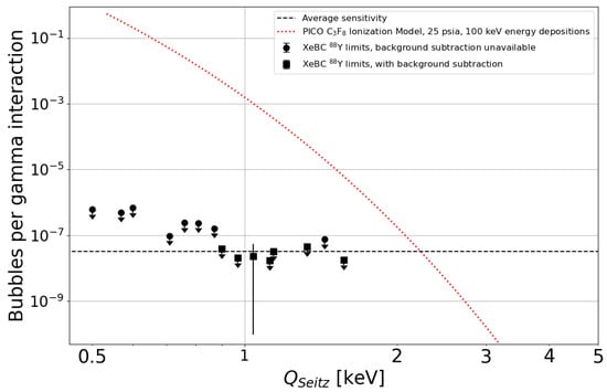 Figure 2. Electron recoil sensitivity of the prototype xenon bubble chamber as a function of superheat (Seitz threshold for bubble nucleation), taken from [13]. No evidence for bubble nucleation by gamma sources is seen, leading to 90% confidence intervals with (square points) and without (round points) ambient nucleating-background subtraction. As reference, the electron recoil rejection in molecular fluids (PICO-60) with the same thermophysical properties as in the xenon chamber is shown in red.