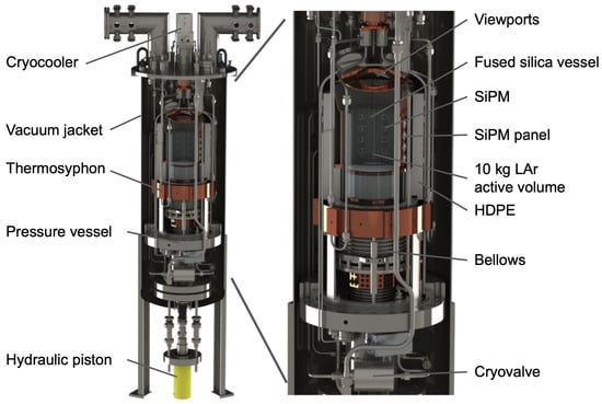 The pressure in the LAr volume is controlled with an externally mounted hydraulic piston which connects through a bellows to the pressure vessel. The pressure vessel is housed in a vacuum jacket ( 0.6 m × 2.0 m) and cooled with liquid-nitrogen thermosyphons [14] connected to a Cryomech AL300 cryocooler. The pressure vessel has view ports for cameras (to be mounted in the vacuum space) and feedthroughs for liquid and electrical connections.
