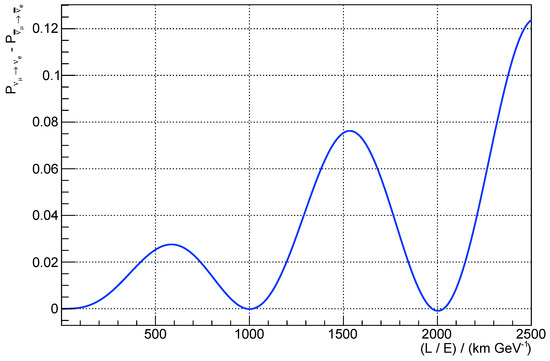 where is the initial neutrino flavor, is the oscillated flavor, indices i, and j are in the range 1–3, is a quadrilinear product of elements of the unitary PMNS [28,29,30,31,32] mixing matrix U, is a difference of squared neutrino masses and , E is the energy of the neutrino and L is the distance between neutrino creation and interaction points; the upper sign in front of the third term corresponds to neutrinos, the lower one (−) to antineutrinos.