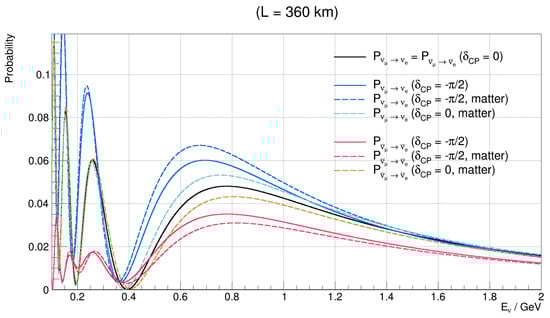 The first appearance maxima in Figure 2 are located roughly in the neutrino energy region of 0.65–0.85 MeV and the second in the region of 0.25–0.35 MeV. The exact position of maxima depends on the choice of value for and whether the matter effects are taken into account. The oscillation probability is significantly altered in the presence of matter around the first maximum, while at the second maximum the probabilities in matter and in vacuum are similar. In fact, it can be shown that at neutrino energies of currently operating and proposed long baseline experiments and terrestrial matter densities, the matter effects around the second maximum have minimal contribution to probability functions [39,40].