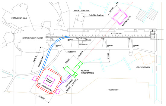 Layout of the ESS accelerator including ESSnuSB modifications required for neutrino beam production and detection. The proposed modifications are show in color: the transfer line (blue), the accumulatior ring (red), the swithcyard (indigo), the neutrino target station (green), and the near detector hall (purple). Reprinted from [25,26].