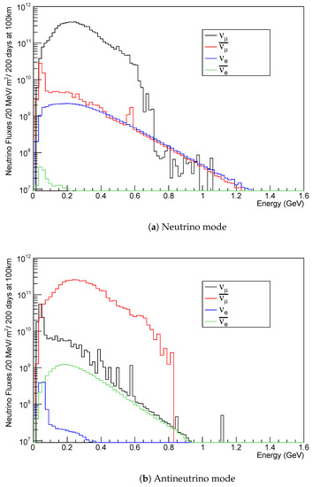 The neutrino flux is dominated by () component in neutrino(antineutrino) mode, which makes up a 97.6% (94.8%) of the flux. The () component in neutrino(antineutrino) mode makes up 1.7% (4.7%) and comes from wrong-sign pion decays (i.e., imperfect charge selection of secondaries) and from decays of tertiary muons (muons produced in the secondary pion decay). The () component in neutrino(antineutrino) mode makes up 0.67% (0.43%) of the flux and comes dominantly from the tertiary muon decays, with a small component from three-body kaon decay. The very small () in neutrino(antineutrino) mode, making up a 0.03% (0.03%) of the flux, comes primarily from wrong-sign tertiary muon decays.