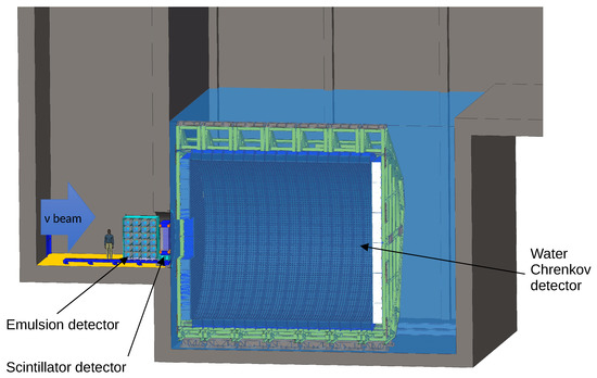 The near detector suite of the ESSnuSB project will consist of three different detectors, in upstream to downstream order: the emulsion detector with water as a target, the SFGD-like granulated scintillator detector and the water Cherenkov detector. The near detector hall is schematically shown in Figure 5.