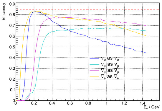 The efficiency to correctly select a neutrino flavor as a function of neutrino energy. Full lines correspond to different neutrino flavors. The dashed line is the efficiency of the fiducial cut. Reprinted from [25,26].