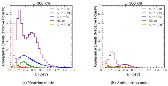 The expected number of observed neutrino events as a function of reconstructed neutrino energy in the far detectors, shown for the signal channel and the most significant background channels. Each plot corresponds to 200 days (effective year) of data taking. Reprinted from [25,26].