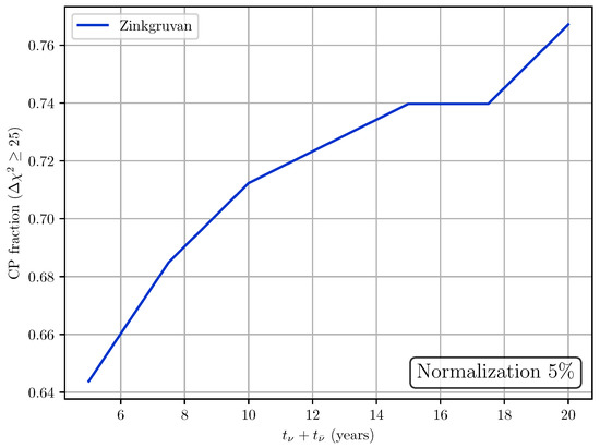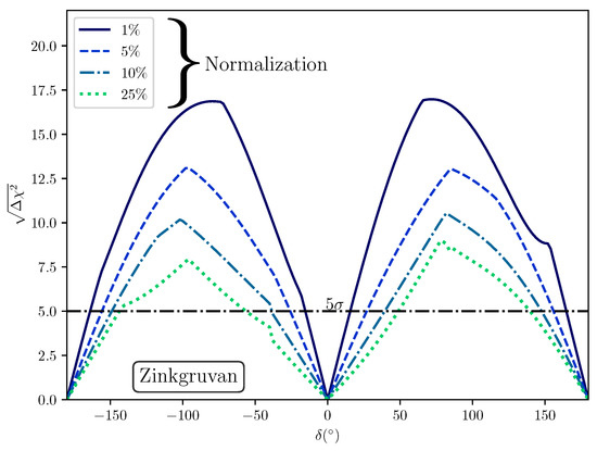 CPV discovery potential as a function of true value, assuming the baseline of 360 km (Zinkgruvan mine) and run-time of 5 y in mode and 5 y in mode. Different lines correspond to different normalization uncertainty assumptions. Reprinted from [25,26].