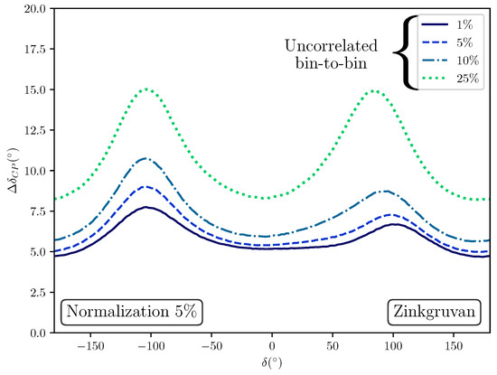 The expected 1 precision for the measurement of the CPV parameter as a function of the true value of , assuming the baseline of 360 km (Zinkgruvan mine) and run-time of 5 y in mode and 5 y in mode. Different lines correspond to different bin-to-bin uncorrelated errors. A normalization error of 5% is applied on top of the bin-to-bin error. Reprinted from [25,26].