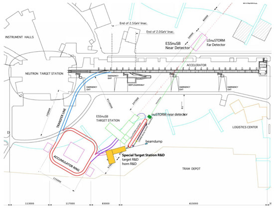 The study performed in the ESSnuSB CDR [25,26] and described so far in this review has mainly focused on the CPV measurement using the ESS neutrino beam. The construction of the large far detector facility will require a significant amount of time and resources: an intermediate step is therefore foreseen, which will focus on the neutrino interaction cross-section measurement, neutrino production target station R&D and study of the additional physics potential of ESSnuSB near and far detectors. These topics will be studied within the ESSnuSB+ [51] project, together with the study of the civil engineering of both ESS upgrades and the far detector site and production of conceptual CAD drawings of the infrastructure. The additional facilities at the ESS site proposed by the ESSnuSB+ project are shown in Figure 12.