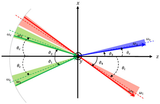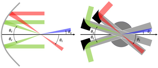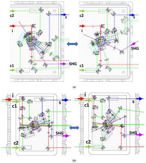 Figure 5a shows the rotary-stage-type geometries in the LA setup covering a large-angle range from 24.8 deg (left) to 47.9 deg (right). The search eventually must be conducted in a vacuum chamber to suppress the atomic background processes. Therefore, we aim at a compact design that can be housed in a vacuum chamber. The incoming laser from the left represents the creation beam 1, creation beam 2, and inducing beam (c1, c2, i), respectively. The beam-like objects after the focal point represent the second harmonic generation (SHG) and the four-wave mixing photons corresponding signal photons (s). In order to guide the generated signal photons to a sensor (photomultiplier, PMT), a calibration laser mimicking signal photon trajectories and the wavelength is necessary. The red inducing beam can be fixed at the bottom optical table in the vacuum chamber, while the incident angles of the other beams can be aligned relative to this beam. The incident angles are changeable by rotating creation stages, which requires re-adjustment of PS and M on the one-axis stage as illustrated in Figure 3, respectively. Figure 5b shows the rotary-stage-type geometries combined with the parabolic-type geometry in the NA setup covering a narrow-angle range from 9.3 deg (left) to 24.8 deg (right). The inducing beam and one of the two creation beams share the common parabolic mirror fixed at the bottom optical table in the vacuum chamber. The narrow angle incidence is realizable by changing the position of incidence of the inducing beam on the surface of the common parabolic mirror by fixing the c1 creation beam.