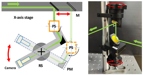 The variable-angle mechanism using the rotary stages associates additional complications. The rotary stages consist of individual aluminum plates placed on individual rotating stages. On the individual aluinum plate, a periscope (PS) and a parabolic mirror (PM) to focus a beam are assembled. The incident angles are changeable by rotating the stage. Changing incident angles must accompany changes of incident points of laser beams. However, typically the laser incident point is not readily movable because high-intensity laser systems are not compact. In order to compensate for this immobility, we introduce periscope (PS) components as shown in the picture of Figure 3. PS consists of a pair of mirrors aligned vertically with the angle of incidence (AOI) of 45°. PS can bend a beam in any directions by rotating the direction of the mirror in the upside of the PS. The height of an optical axis is changeable by adjusting the relative distance between the two mirrors in the incident and outgoing sides. The change of incident angles is compensated by the parallel movement of the mirror (M) along the x-axis rail stage in advance of injection to the PS. However, since PS reflects a beam to PM with a possibly large angle, it is necessary to evaluate the effect that the incident linearly polarized state becomes an elliptically polarized one. As we demonstrated in the pilot search, the change of the polarization state can be evaluated based on the measurement of Stokes parameters [21]. In this collision system, incident angles are changeable without moving the collision point by setting the PM’s focal point at the common center of the rotating stages (RSs). The focal spots can be checked using a camera which also rotates around the center. By stacking layers consisting of an aluminum plate and a rotating stage, the collision angle of the three beams can be independently varied. We note, however, that it is not necessary to change the angles of all three colliding beams. As we discuss later, one of the three beams can be fixed and we have only to adjust the AOIs of the other two laser beams relative to the fixed one.