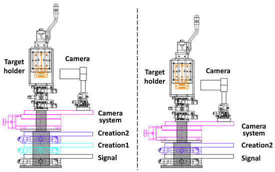 Figure 4 shows side views of the designed collision systems. First, the three beam interaction point (IP) is defined with the center of two thin crossed wires. The wire target must be immovable with respect to the multi-layer stage movements as discussed below. The common layers between the LA and NA collision cases are the bottom signal sampling layer and the top camera layer to monitor beam profiles at IP. The signal layer is necessary to move the detection point of generated signal photons because the signal direction must change depending on collision angles. We introduce two layers for the two creation laser beams in the LA collision case, while only one layer for one of the two creation laser beams is necessary in the NA collision case because the other creation and the inducing beams share a common parabolic mirror which is fixed to the optical table. The breakdown of the individual layers from the bottom are thus as follows: signal light (black), creation light 1 (cyan), creation light 2 (purple), and camera system (magenta) for LA and signal light (black), creation light 2 (purple), and camera system (magenta) for NA.