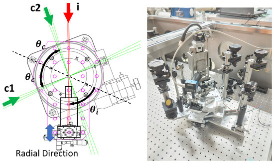 Figure 6 shows a top view of the top common camera layer together with a picture assembling all the components. By preparing an independent layer only for the camera with a motorized rotation stage, beam profiles of all the three lasers at IP can be monitored and recorded. By reading the scale on the motorized rotation stage, the camera position can be adjusted to the incident angles relative to the bisecting line (dashed line) which is set by with respect to the inducing beam direction. We note that the camera position must be calibrated so that the camera surface is placed perpendicularly to the radial direction from the central IP position with an equal distance for any rotated positions. By changing the camera position along the radial direction aligned to IP by the local stage on which the camera is installed, one can check whether a beam profile center stays at the same pixel point in the camera or not. If there is a drift of the profile center, that is, a deviation from the perpendicular direction, one can locally fine-tune the camera positions. With this fine-tuning method, AOIs can be adjusted with sufficient accuracy of 0.1°.