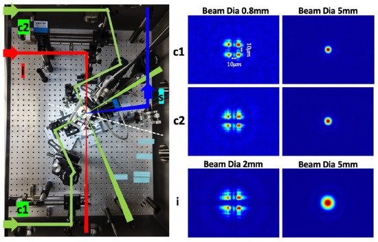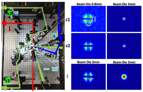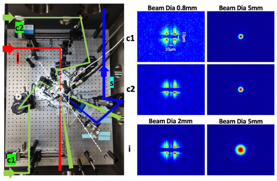Picture of large-angle setup (left) and focal images of three individual beams (right) when lasers with a common beam diameter of 5 mm are focused into IP at degree. In the picture, the optical paths of the three beams, consisting of the creation beam (c1), the creation beam (c2), and the inducing beam (i), as well as the signal photon line (s) are drawn. The middle column shows the images of three individual lasers when they hit the crossed point between two thin target wires of a 10 m diameter.