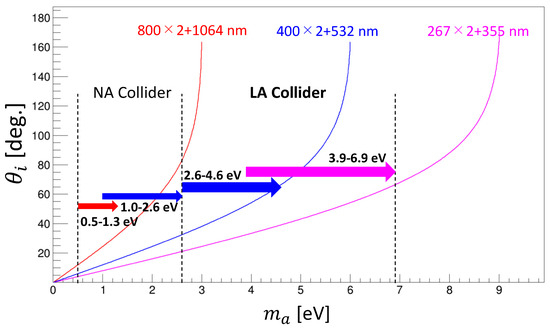 We provide sensitivity projections based on the LA and NA collision setups in the following. Figure 10 shows incident angles of the inducing beam as a function of ALP mass which is determined by the incident angles of creation beams and their wavelengths. We plan to use three combinations of laser wavelengths for fundamental, second harmonic and third harmonic cases. Namely, beginning with 800 nm (Ti:Sapphire) for two creation beams and 1064 nm (Nd:YAG) for an inducing beam denoted as nm (red), we extend the search to those with nm (blue) and nm (magenta). Depending on the combinations between the two angle setups and laser wavelengths, accessible mass ranges are different. The figure shows our projections to cover from 0.5 to 6.9 eV with colored arrows corresponding to different wavelengths combinations where accessible mass ranges are specified.