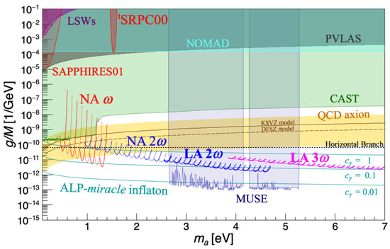 where is the overall detection efficiency and is the number of shots. A coupling constant can be numerically calculated by solving Equation (5) for an ALP mass and a given observed number of photons . We assumed the as the noise originating photon-like signals . NA, NA, LA and LA are sensitivities corresponding to the individual arrows classified in Figure 10. The details of the numerical calculations and the derivation of the upper limits on the coupling can be found in [20,21], respectively. The red shaded area shows the excluded range based on SRPC in quasi-parallel collision geometry (SAPPHIRES01) [19]. The red filled area indicates the excluded range with the fixed angle pilot search, 00 [21]. The gray area shows the excluded region by the vacuum magnetic birefringence experiment (PVLAS [22]). The purple areas are excluded regions by the Light-Shining-through-a-Wall (LSW) experiments (ALPS [23] and OSQAR [24]). The light-cyan horizontal solid line indicates the upper limit from the search for eV (pseudo)scalar penetrating particles in the SPS neutrino beam (NOMAD) [25]. The horizontal dotted line is the upper limit from the Horizontal Branch observation [26]. The blue areas are exclusion regions from the optical MUSE-faint survey [27,28,29,30,31,32]. The green area indicates the excluded region by the helioscope experiment CAST [31]. The yellow band and the upper solid brown line are the predictions from the benchmark QCD axion models: the KSVZ model [33] with and , respectively, while the bottom dashed brown line is the prediction from the DFSZ model [34] with . The cyan lines are the predictions from the ALP miracle model [12] with the model parameters .
