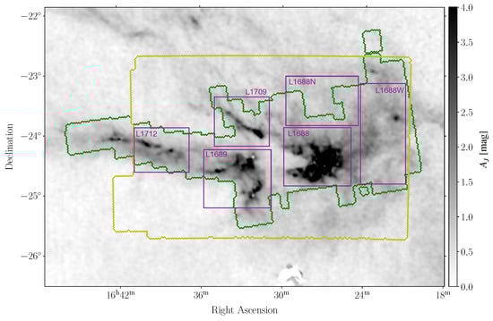 The extinction map of the Ophiuchus cloud determined by Juvela and Montillaud [29] using the 2MASS survey. The resolution of the map is ∼3.0 arcmin. The irregular outlines in green and yellow indicate the spatial coverage of the Spitzer and UKIDSS observations, respectively. The entire region is subdivided into six distinct sub-regions, delineated by solid-line rectangles, namely L1712, L1689, L1709, L1688, L1688N, and L1688W.