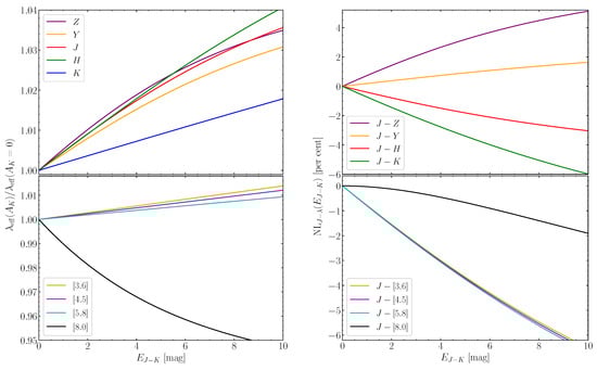 where represents the intrinsic flux of the stellar spectra, and denotes the relative response function of the filter. The effective wavelength when the extinction is defined as the static effective wavelength , which is listed in Table 1. However, the effective wavelength is subject to shifting relative to static wavelength due to extinction . To analyze the “shifting effect”, we utilize a K0III-type stellar spectrum from Castelli and Kurucz [37] with an effective temperature of 4750 K, = 2.5, and solar metallicity. We assume the extinction law of the WD01 model. The left panels in Figure 2 depict the ratio of the effective wavelength at to the static wavelength as a function of the reddening . With the exception of the effective wavelength of the IRAC [8.0] band, which shifts toward shorter wavelengths, the effective wavelengths of all other bands shift toward longer wavelengths. This difference can be attributed to the 9.8 m extinction feature caused by silicate dust. The effective wavelengths of most bands have relative changes of a few per cent over the range of considered reddening mag.