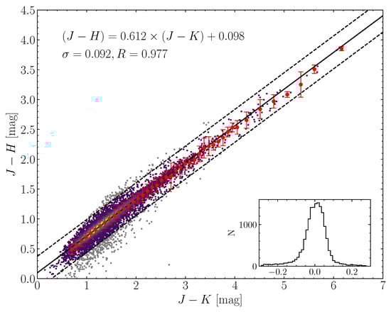 When conducting a linear fit to the vs. color–color diagram, we apply a removal technique to identify and exclude outliers in a single iteration. Additionally, we exclude sources with mag from the analysis.