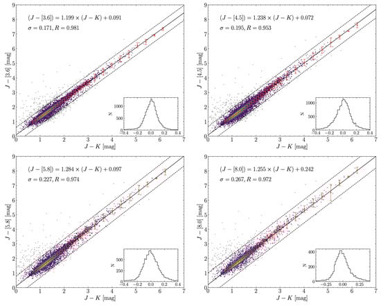 By utilizing the derived and , we employed Equation (1) to calculate the extinction relative to the K band . The calculated values are presented in Table 2. The uncertainties associated with were determined by propagating the uncertainties from both and . Additionally, for comparison purposes, we computed the extinction using obtained from Indebetouw et al. [33]. It is important to note that a smaller value of leads to a flatter relationship, resulting in larger values of in the IRAC bands and smaller values of in the UKIDSS bands.