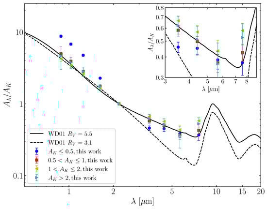 Based on the obtained values for each sub-sample as listed in Table 4, we can further calculate the power-law index and for the NIR extinction law using Equation (2). By utilizing the derived values for each sub-sample, we are able to calculate the extinction ratios . These results are presented in Table 4 and visualized in Figure 7. It is evident that the extinction law becomes flatter with increasing . Specifically, the values of in the NIR bands decrease, while those in the MIR bands increase with increasing . Overall, our findings are consistent with the study conducted by Chapman et al. [46], who also observed a similar trend of the extinction law becoming flatter with increasing extinction. However, it should be noted that there are significant uncertainties in the results of the sub-sample with .