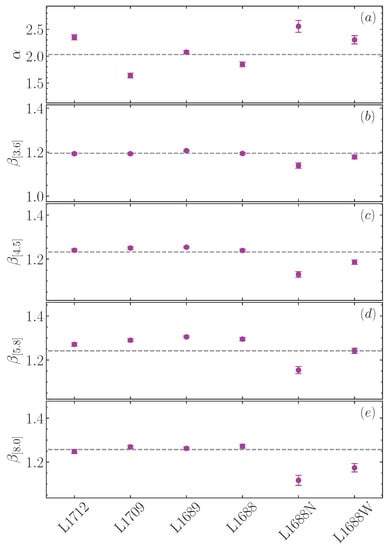 We now turn our attention to investigating the spatial variation of the extinction law within the Ophiuchus cloud. The Ophiuchus region consists of multiple dark clouds, namely L1712, L1689, L1709, and L1688, arranged in an east-to-west orientation (see Figure 1). Additionally, we selected two regions located to the north and west of L1688, referred to as L1688N and L1688W, respectively. For each of these sub-regions, we performed the fitting procedure and obtained the NIR extinction power-law index by fitting the versus color–color diagram. The color-excess ratios, , were determined for the Spitzer/IRAC bands. Figure 8 displays the corresponding values of and for these sub-regions.